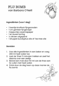 Onze grootouders hadden het vaak bij het rechte eind. Een warme drank met citroen en rauwe honing werkt niet alleen verzachtend, maar helpt ook de goede bacteriën in je keel. Citroen zorgt voor een licht zuur milieu waarin nuttige bacteriën goed gedijen, terwijl rauwe honing ontstekingsremmend werkt. Let er wel op dat je echte, onbewerkte honing van een lokale imker gebruikt, die bevat nog alle waardevolle enzymen en voedingsstoffen. Online kan je de Flu Bomb van Barbara O’neill vinden.
